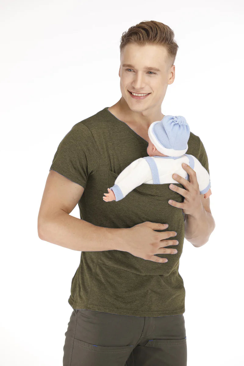 This multifunctional shirt allows you to carry your baby comfortably and hands-free. The spacious front pouch provides a secure and cozy space for your little one. Perfect for parents on the go.